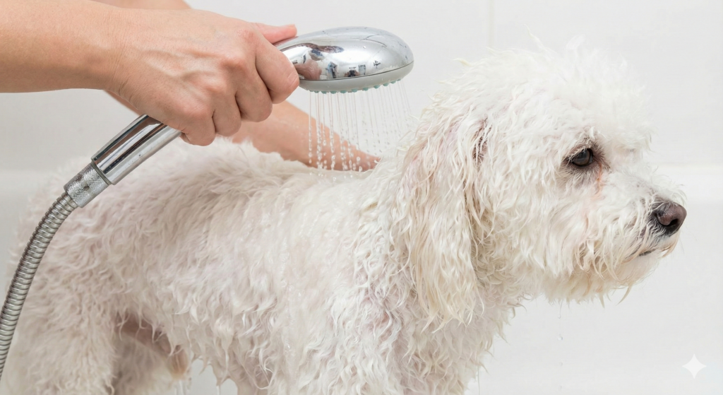 犬の皮膚は人間より薄いため、熱いお湯は乾燥の原因になります。37℃〜38℃のぬるま湯が適温です。 ビションフリーゼの毛は水を弾きやすいので、シャワーヘッドを地肌に密着させるようにして、毛の根元までしっかり濡らします。ここで汚れの7割を落とすイメージです。